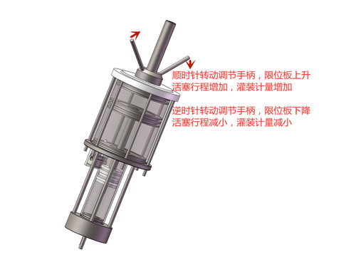 (6)調(diào)灌液計(jì)量:灌液機(jī)計(jì)量調(diào)節(jié)。可以通過(guò)旋轉(zhuǎn)灌液計(jì)量缸頂部的調(diào)節(jié)旋柄來(lái)調(diào)節(jié)計(jì)量缸氣缸定位活塞的高度,從而改變計(jì)量缸活塞的行程來(lái)最終改變灌裝的計(jì)量大小。(注意,在調(diào)節(jié)前,要關(guān)閉主機(jī)氣源和計(jì)量缸上行氣處的手滑閥,并等待設(shè)備中壓縮空氣排空,否則無(wú)法轉(zhuǎn)動(dòng)旋柄。最好是由小往大調(diào)節(jié)計(jì)量(順時(shí)針轉(zhuǎn)動(dòng)手柄,增加計(jì)量),如果是從大往小調(diào)節(jié)(逆時(shí)針轉(zhuǎn)動(dòng)手柄,減小計(jì)量),而且調(diào)節(jié)的幅度較大,可能會(huì)出現(xiàn)調(diào)節(jié)一段距離后旋柄再無(wú)法再繼續(xù)轉(zhuǎn)動(dòng)的情況,此時(shí)則需要將灌液頭的灌液嘴向上頂一下,適當(dāng)排出一點(diǎn)液體即可繼續(xù)調(diào)節(jié)了。先將計(jì)量調(diào)節(jié)到一個(gè)大概的位置,進(jìn)行試灌裝,然后根據(jù)灌裝量來(lái)進(jìn)行調(diào)整計(jì)量,直至計(jì)量達(dá)到所需要求。